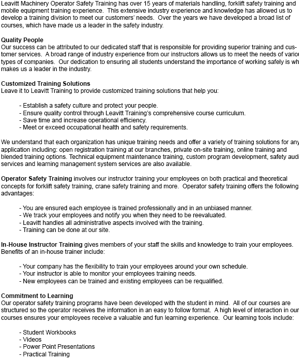 We offer a range of alternatives to help teach your personnel. Whether you are searching for someone to come instruct at your place of work or would prefer to train at our facility, we can accomodate all your needs. Every course can be tailored to your equipment and workplace.